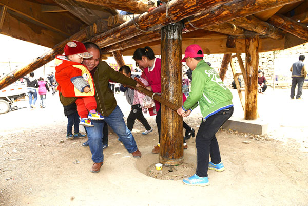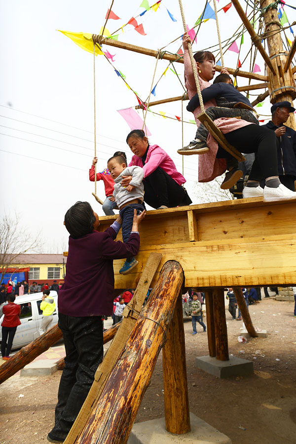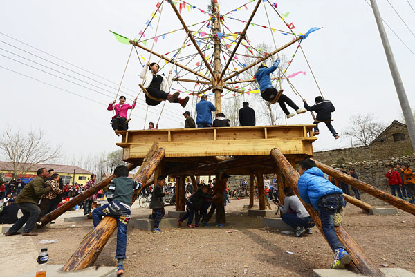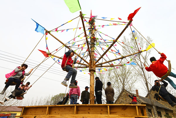 4月4日,莒縣碁山鎮西山旺村,村民和回家過清明節的親朋好友一起來過秋千節,以“轉悠千”的方式,共同慶祝清明節。
