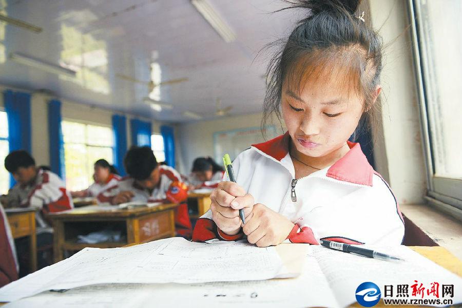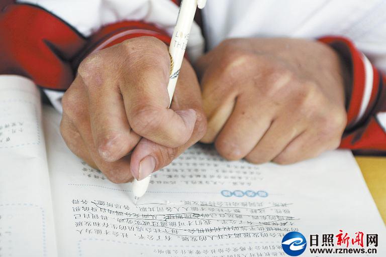5月6日,莒縣小店鎮中心初中,八年級四班在進行地理、生物兩門課程的模擬考試,時間是90分鐘,到收卷時,何緒莉的試卷答了還不到一半。班主任老師王遠周告訴記者,何緒莉患有腦癱疾病,她寫字非常困難,別人是寫字,何緒莉是“戳字”,一場考試下來,何緒莉緊握筆的手指要疼好幾天,試卷也千瘡百孔,許多字和句子很難辨認。