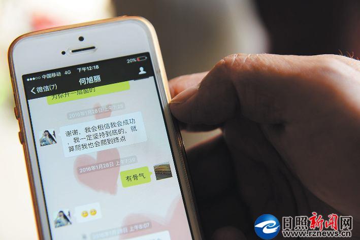 采訪結束時,班主任老師王遠周給我們看了一條何緒莉發給他的短信:“我相信我會成功的,我一定堅持到底的,就算爬我也會爬到終點。”