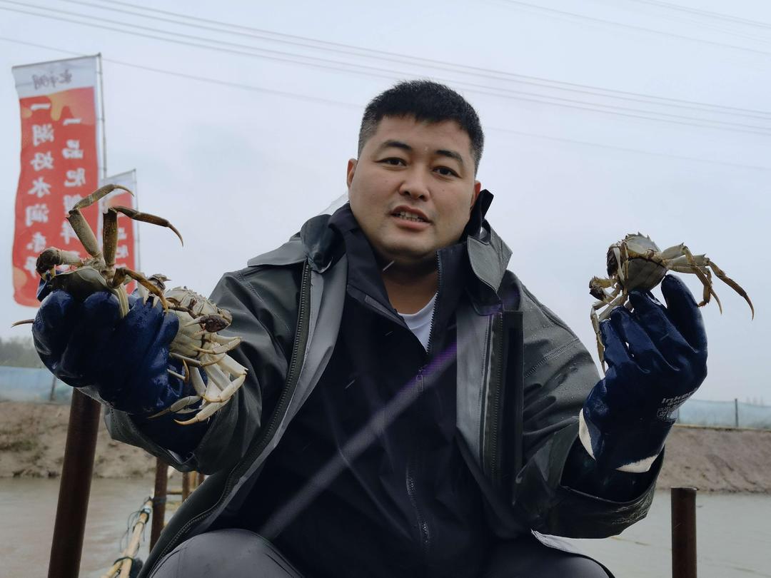 10月17日一早,在東平湖畔西豆山下的800畝蟹塘里,身著防水皮褲的“90后”小伙顧行志提起水中的蟹籠,一只只肥碩的東平湖大閘蟹爬上爬下。