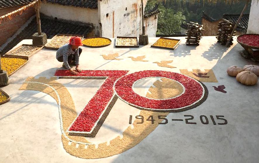 8月30日,江西省婺源縣江灣鎮篁嶺村村民用豐收的玉米、紅辣椒、小米等各色農產品,擺出中國人民抗日戰爭暨世界反法西斯戰爭勝利70周年紀念活動標識圖案。