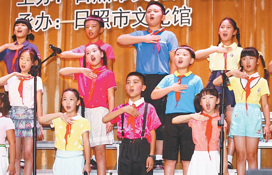 9月1日,市文化館童聲合唱團演唱《長城謠》。 當日,市文化館舉辦“紀念中國人民抗日戰爭暨世界反法西斯戰爭勝利70周年”文藝晚會,來自各社區、街道的群眾,以合唱、歌舞劇、詩朗誦等形式,重溫抗戰歷史,緬懷革命先輩。 (記者 李青 攝)
